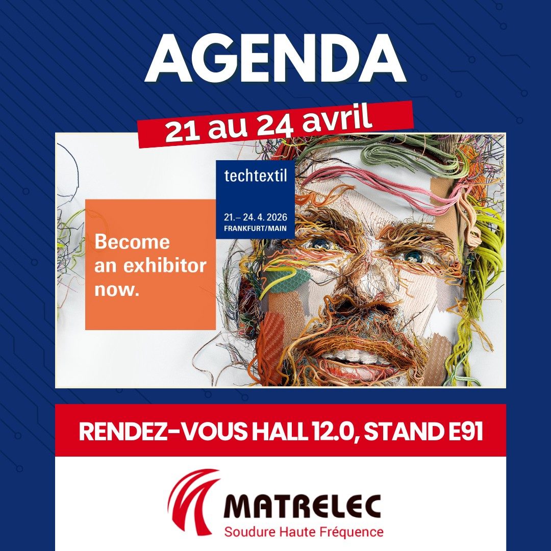 Du 21 au 24 avril 2026, Matrelec participera au Salon Techtextil, l’événement international de référence consacré aux textiles techniques et aux non-tissés. Le salon se tiendra au Messe Frankfurt (Allemagne) et réunira les principaux acteurs industriels et innovateurs du secteur.